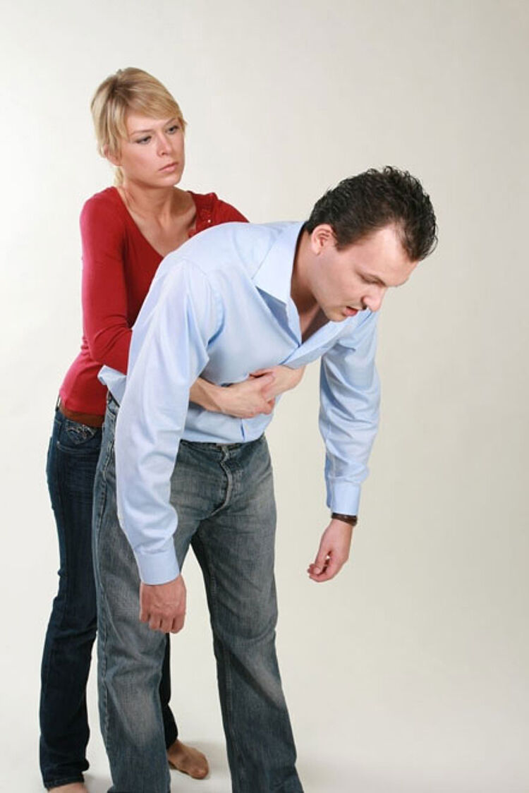 • Den nach vorne gebeugten Betroffenen mit beiden Armen von hinten um den Bauch fassen