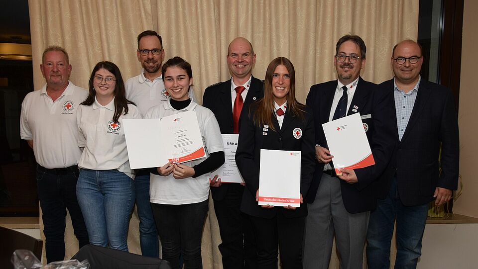 Der Vorsitzende Bürgermeister Armin Mößner würdigte Wolffs große Verdienste, ernannte ihn zum Ehrenbereitschaftsleiter und verlieh ihm das Dienststellungsabzeichen „Bereitschaftsleiter ehrenhalber“. Bereits seit 35 Jahren setzt Wolff sich für den Ortsverein ein, darum verlieh Mößner ihm eine seltene goldene Auszeichnungsspange. Weiter ehrte der Vorsitzende Schatzmeister Matthias Müller für 30 Jahre Einsatz, Jugendleiterin Heike Strobel für achtjährige Jugendrotkreuzgruppenleitung und Bereitschaftsmitglied Amy Zajac für fünf Jahre aktiven Dienst mit Auszeichnungsspangen und Urkunden.